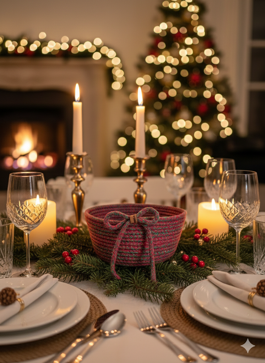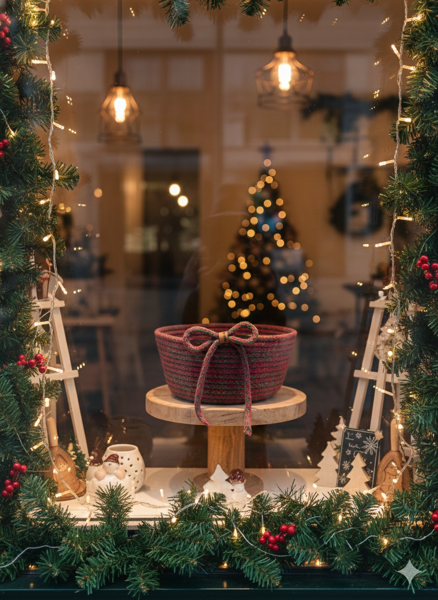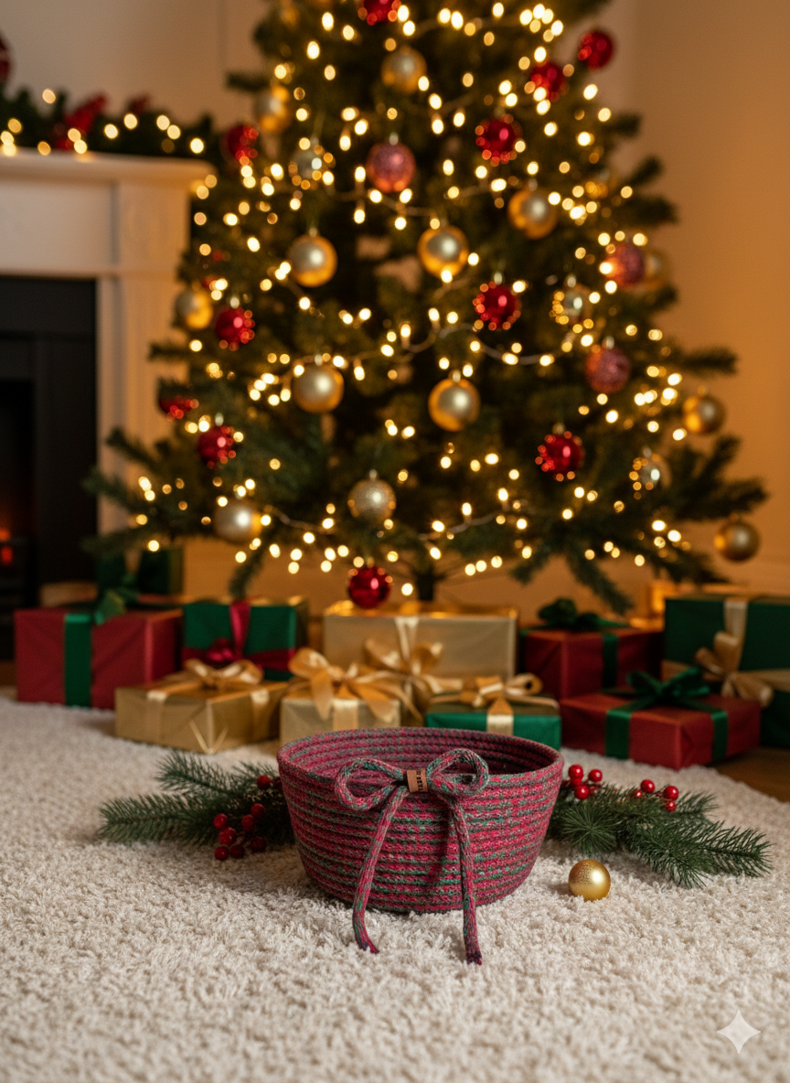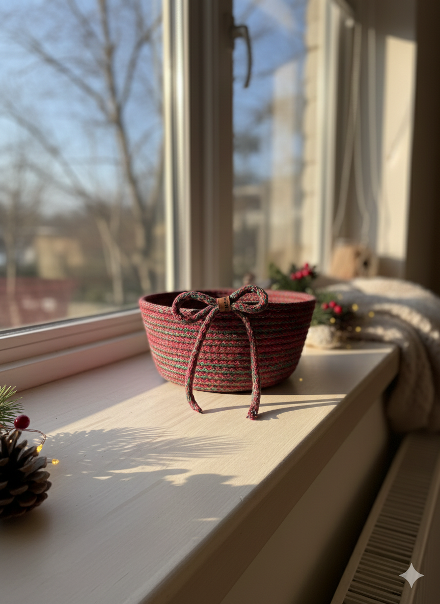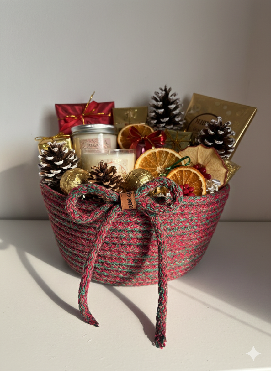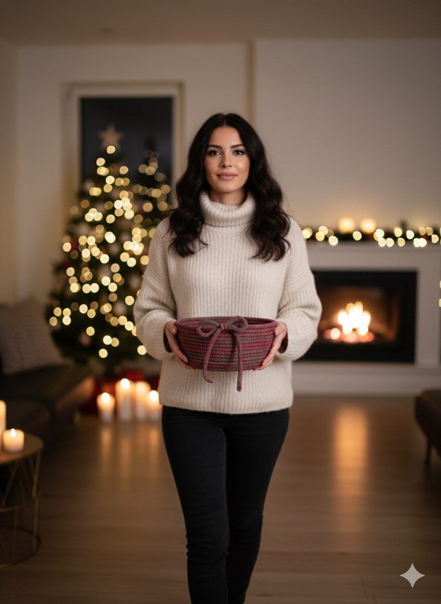 El emeğiyle üretilen bu özel tasarım sepet, yılbaşı sofralarında şık bir sunum ürünü olarak kullanılabilir ya da içine çikolata, mum, kozalak ve küçük sürprizler eklenerek sevdiklerinize anlamlı bir hediye haline getirilebilir. Doğal dokusu sayesinde hem klasik hem modern dekorasyonlara uyum sağlar.