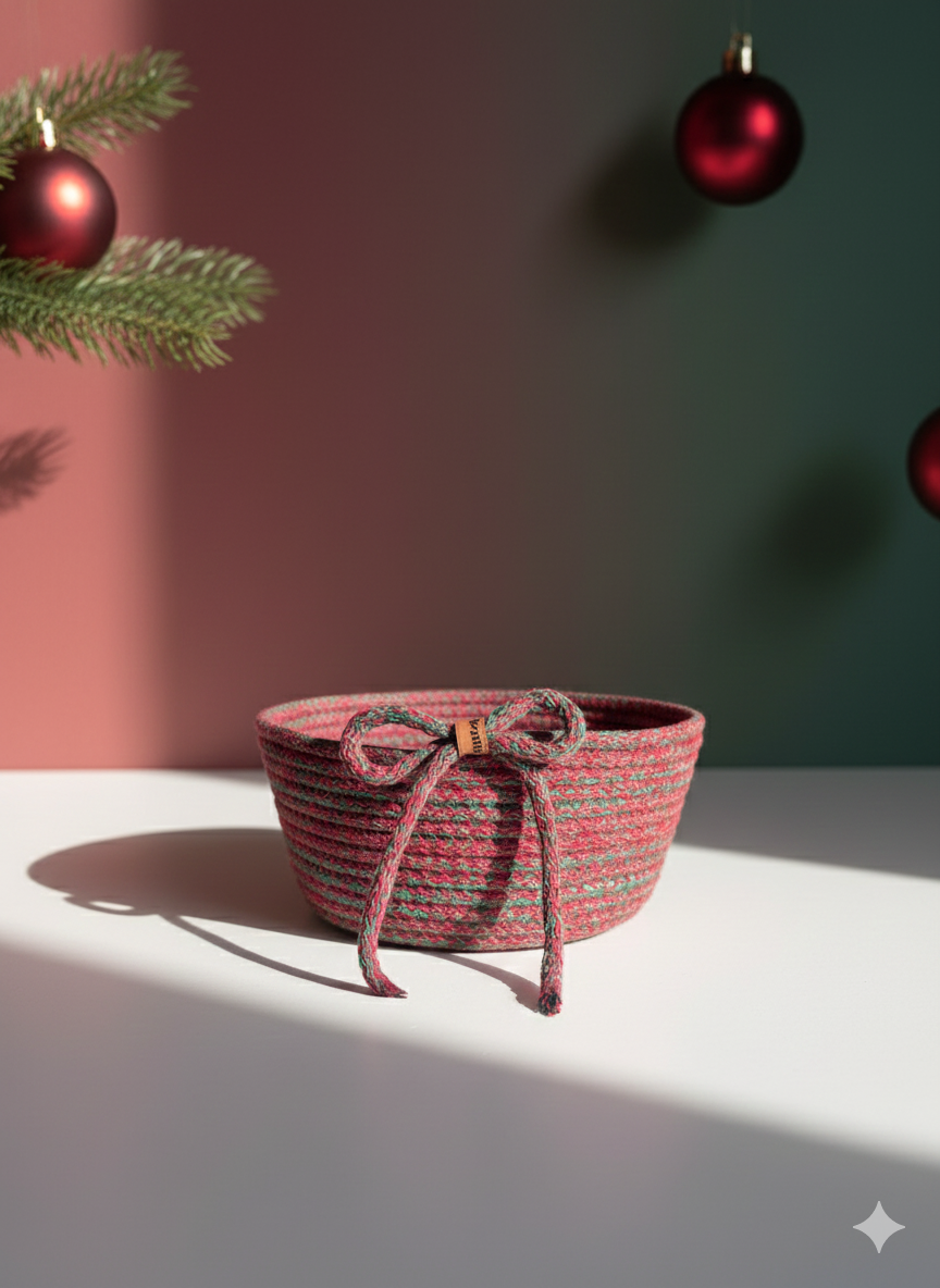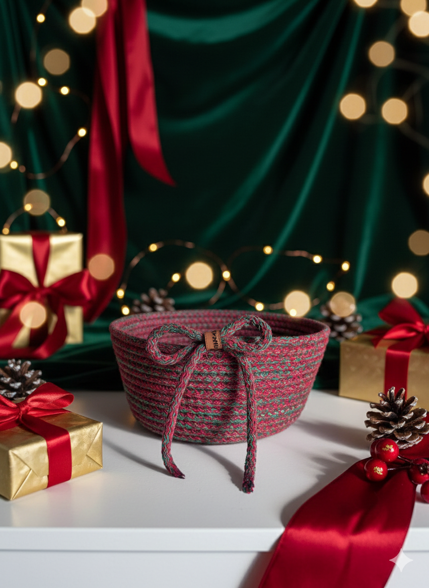 Yeni yılın sıcak ruhunu evinize taşıyan Ravenson el yapımı yılbaşı sepeti; kırmızı ve yeşilin uyumlu dokusu, doğal jüt ipten örülmüş yapısı ve zarif fiyonk detayıyla hem dekoratif hem de hediyelik olarak benzersiz bir üründür.